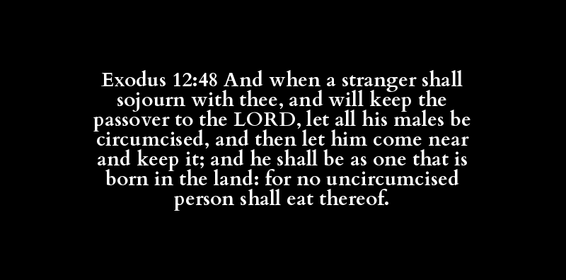 Exodus 12:48 And when a stranger shall sojourn with thee, and will keep the passover to the LORD, let all his males be circumcised, and then let him come near and keep it; and he shall be as one that is born in the land: for no uncircumcised person shall eat thereof.