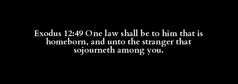 Exodus 12:49 One law shall be to him that is homeborn, and unto the stranger that sojourneth among you.
