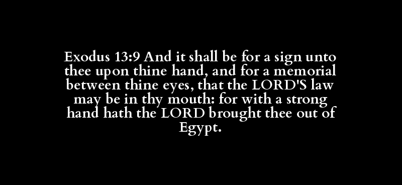 Exodus 13:9 And it shall be for a sign unto thee upon thine hand, and for a memorial between thine eyes, that the LORD'S law may be in thy mouth: for with a strong hand hath the LORD brought thee out of Egypt.