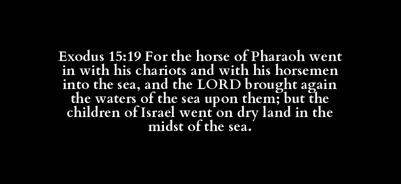 Exodus 15:19 For the horse of Pharaoh went in with his chariots and with his horsemen into the sea, and the LORD brought again the waters of the sea upon them; but the children of Israel went on dry land in the midst of the sea.