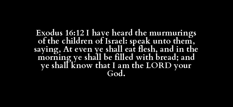 Exodus 16:12 I have heard the murmurings of the children of Israel: speak unto them, saying, At even ye shall eat flesh, and in the morning ye shall be filled with bread; and ye shall know that I am the LORD your God.