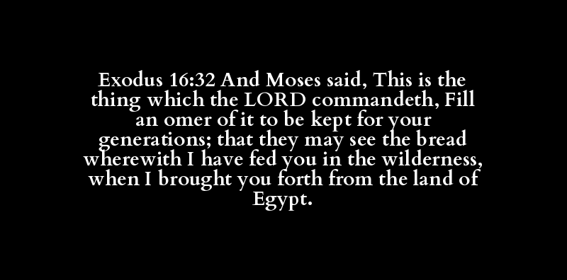 Exodus 16:32 And Moses said, This is the thing which the LORD commandeth, Fill an omer of it to be kept for your generations; that they may see the bread wherewith I have fed you in the wilderness, when I brought you forth from the land of Egypt.