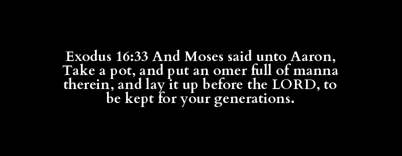 Exodus 16:33 And Moses said unto Aaron, Take a pot, and put an omer full of manna therein, and lay it up before the LORD, to be kept for your generations.