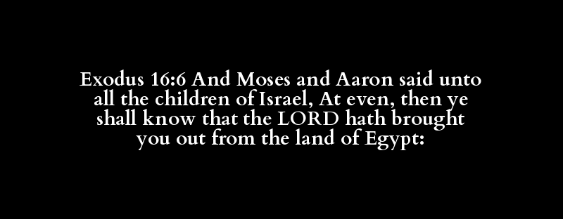 Exodus 16:6 And Moses and Aaron said unto all the children of Israel, At even, then ye shall know that the LORD hath brought you out from the land of Egypt: