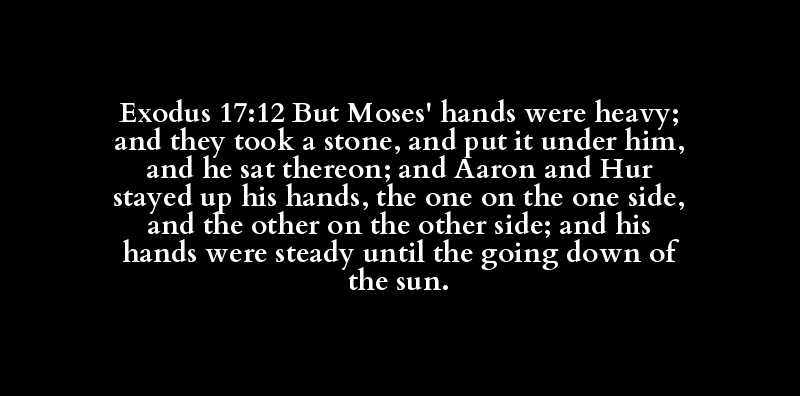 Exodus 17:12 But Moses' hands were heavy; and they took a stone, and put it under him, and he sat thereon; and Aaron and Hur stayed up his hands, the one on the one side, and the other on the other side; and his hands were steady until the going down of the sun.