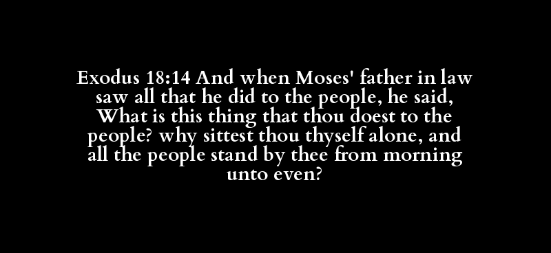 Exodus 18:14 And when Moses' father in law saw all that he did to the people, he said, What is this thing that thou doest to the people? why sittest thou thyself alone, and all the people stand by thee from morning unto even?