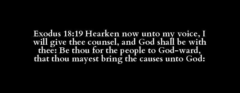 Exodus 18:19 Hearken now unto my voice, I will give thee counsel, and God shall be with thee: Be thou for the people to God-ward, that thou mayest bring the causes unto God: