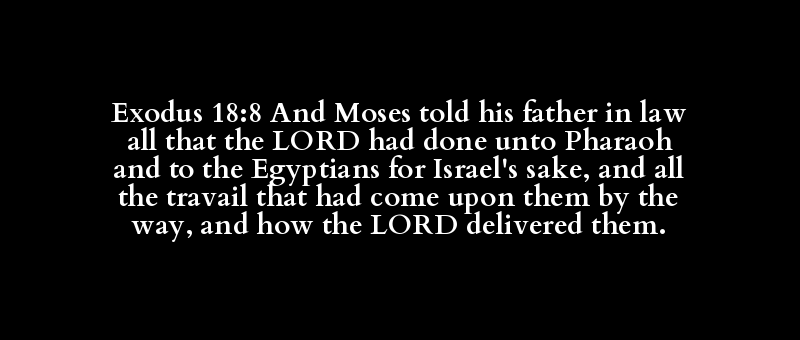 Exodus 18:8 And Moses told his father in law all that the LORD had done unto Pharaoh and to the Egyptians for Israel's sake, and all the travail that had come upon them by the way, and how the LORD delivered them.