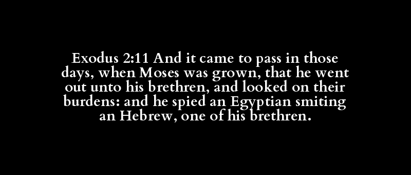 Exodus 2:11 And it came to pass in those days, when Moses was grown, that he went out unto his brethren, and looked on their burdens: and he spied an Egyptian smiting an Hebrew, one of his brethren.