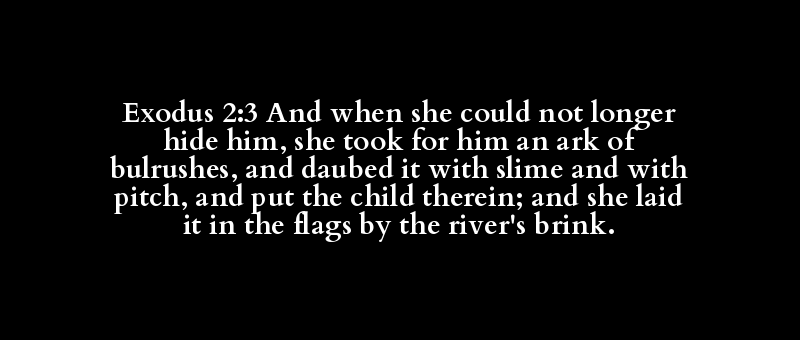Exodus 2:3 And when she could not longer hide him, she took for him an ark of bulrushes, and daubed it with slime and with pitch, and put the child therein; and she laid it in the flags by the river's brink.