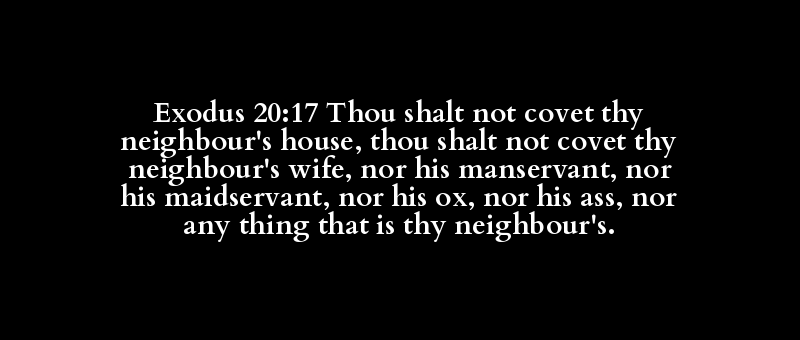 Exodus 20:17 Thou shalt not covet thy neighbour's house, thou shalt not covet thy neighbour's wife, nor his manservant, nor his maidservant, nor his ox, nor his ass, nor any thing that is thy neighbour's.