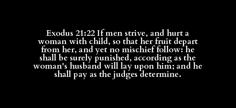 Exodus 21:22 If men strive, and hurt a woman with child, so that her fruit depart from her, and yet no mischief follow: he shall be surely punished, according as the woman's husband will lay upon him; and he shall pay as the judges determine.