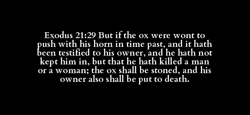 Exodus 21:29 But if the ox were wont to push with his horn in time past, and it hath been testified to his owner, and he hath not kept him in, but that he hath killed a man or a woman; the ox shall be stoned, and his owner also shall be put to death.