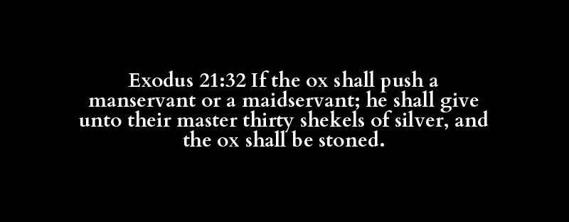 Exodus 21:32 If the ox shall push a manservant or a maidservant; he shall give unto their master thirty shekels of silver, and the ox shall be stoned.