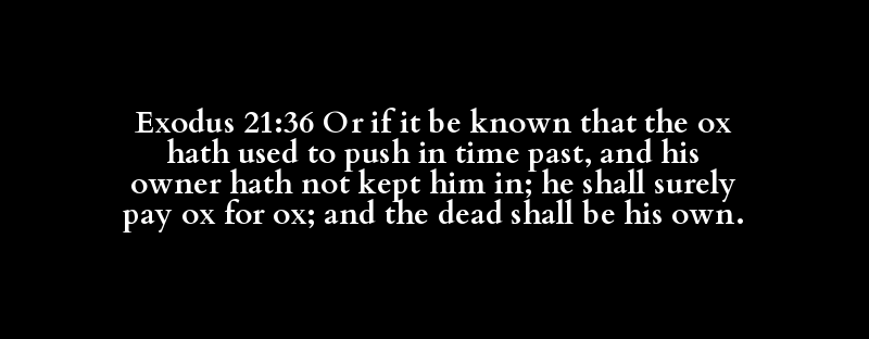 Exodus 21:36 Or if it be known that the ox hath used to push in time past, and his owner hath not kept him in; he shall surely pay ox for ox; and the dead shall be his own.