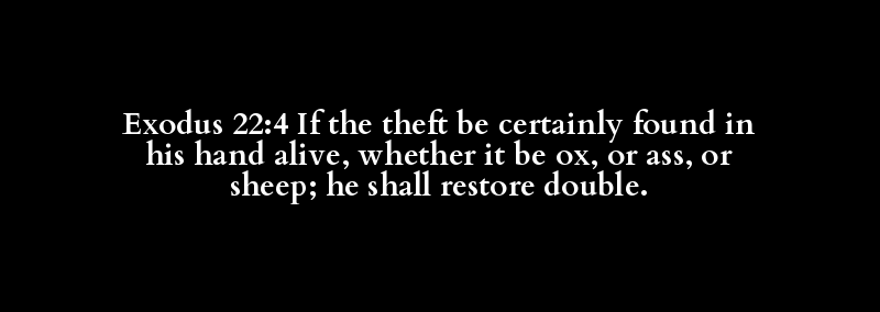 Exodus 22:4 If the theft be certainly found in his hand alive, whether it be ox, or ass, or sheep; he shall restore double.