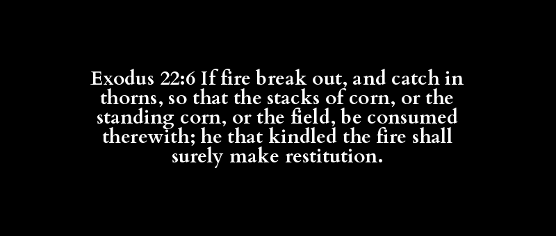 Exodus 22:6 If fire break out, and catch in thorns, so that the stacks of corn, or the standing corn, or the field, be consumed therewith; he that kindled the fire shall surely make restitution.