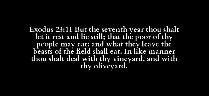 Exodus 23:11 But the seventh year thou shalt let it rest and lie still; that the poor of thy people may eat: and what they leave the beasts of the field shall eat. In like manner thou shalt deal with thy vineyard, and with thy oliveyard.