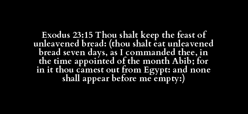 Exodus 23:15 Thou shalt keep the feast of unleavened bread: (thou shalt eat unleavened bread seven days, as I commanded thee, in the time appointed of the month Abib; for in it thou camest out from Egypt: and none shall appear before me empty:)