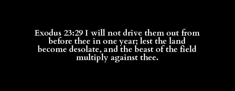 Exodus 23:29 I will not drive them out from before thee in one year; lest the land become desolate, and the beast of the field multiply against thee.