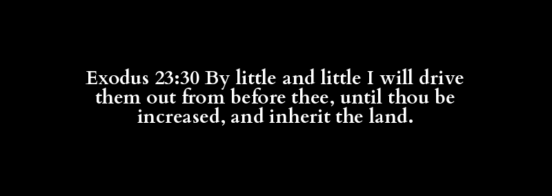 Exodus 23:30 By little and little I will drive them out from before thee, until thou be increased, and inherit the land.