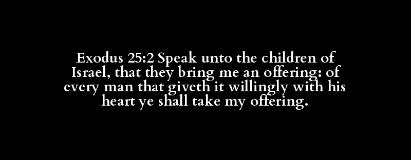 Exodus 25:2 Speak unto the children of Israel, that they bring me an offering: of every man that giveth it willingly with his heart ye shall take my offering.