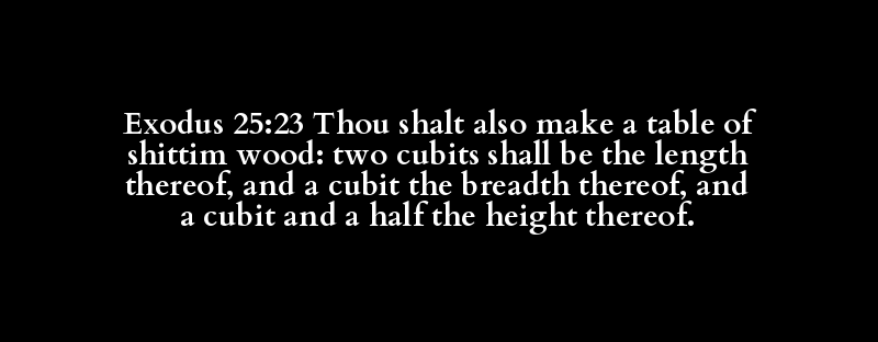 Exodus 25:23 Thou shalt also make a table of shittim wood: two cubits shall be the length thereof, and a cubit the breadth thereof, and a cubit and a half the height thereof.