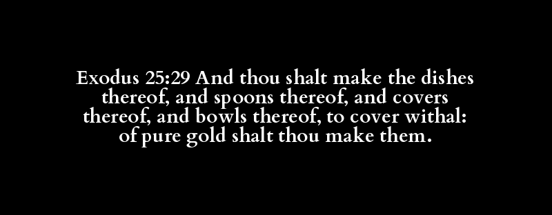 Exodus 25:29 And thou shalt make the dishes thereof, and spoons thereof, and covers thereof, and bowls thereof, to cover withal: of pure gold shalt thou make them.