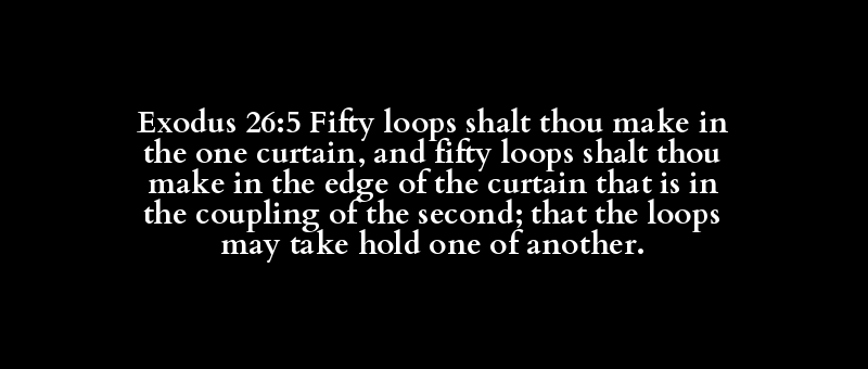 Exodus 26:5 Fifty loops shalt thou make in the one curtain, and fifty loops shalt thou make in the edge of the curtain that is in the coupling of the second; that the loops may take hold one of another.