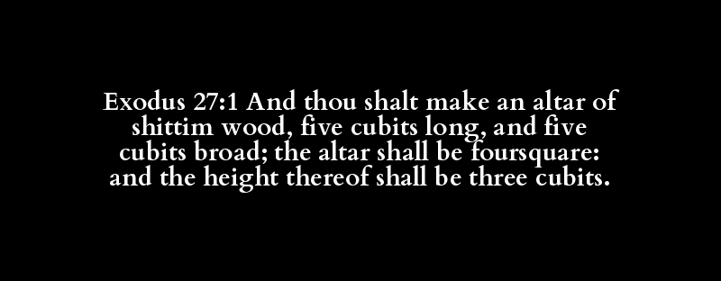 Exodus 27:1 And thou shalt make an altar of shittim wood, five cubits long, and five cubits broad; the altar shall be foursquare: and the height thereof shall be three cubits.