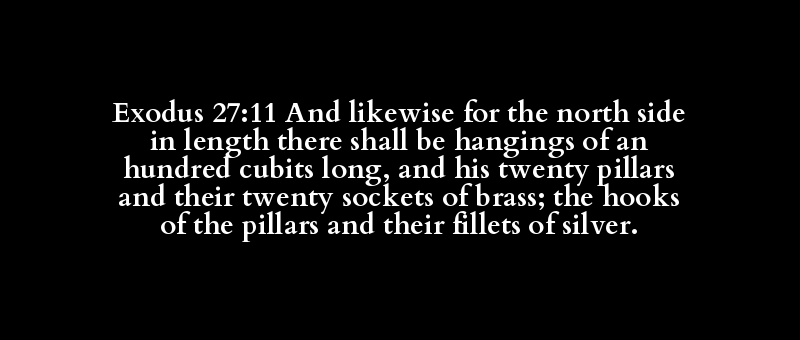 Exodus 27:11 And likewise for the north side in length there shall be hangings of an hundred cubits long, and his twenty pillars and their twenty sockets of brass; the hooks of the pillars and their fillets of silver.