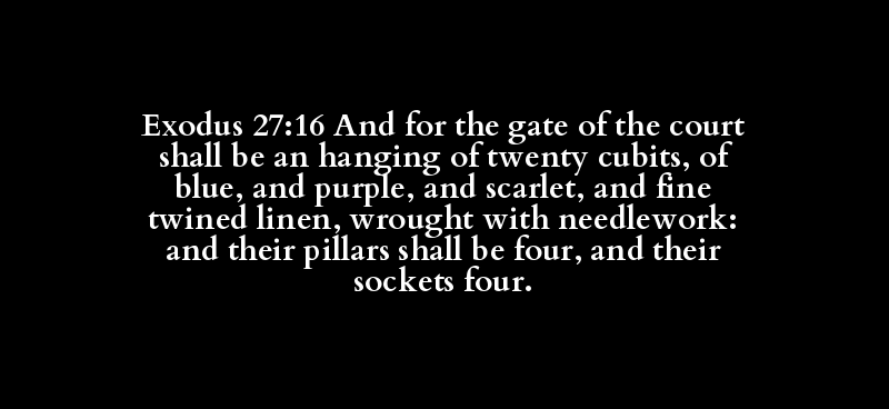 Exodus 27:16 And for the gate of the court shall be an hanging of twenty cubits, of blue, and purple, and scarlet, and fine twined linen, wrought with needlework: and their pillars shall be four, and their sockets four.