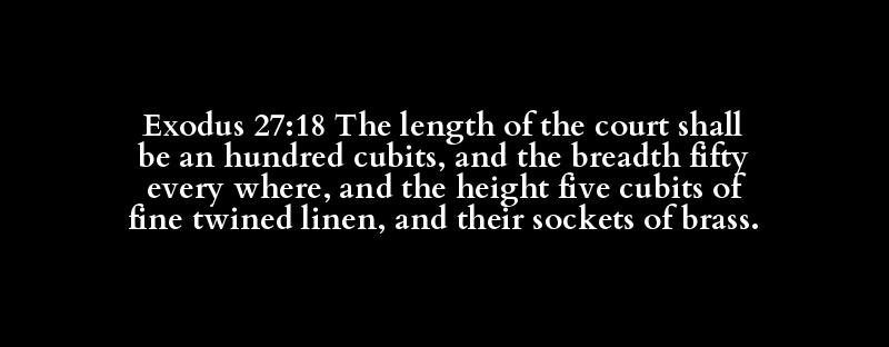 Exodus 27:18 The length of the court shall be an hundred cubits, and the breadth fifty every where, and the height five cubits of fine twined linen, and their sockets of brass.