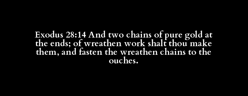Exodus 28:14 And two chains of pure gold at the ends; of wreathen work shalt thou make them, and fasten the wreathen chains to the ouches.