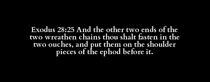 Exodus 28:25 And the other two ends of the two wreathen chains thou shalt fasten in the two ouches, and put them on the shoulder pieces of the ephod before it.