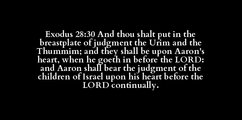 Exodus 28:30 And thou shalt put in the breastplate of judgment the Urim and the Thummim; and they shall be upon Aaron's heart, when he goeth in before the LORD: and Aaron shall bear the judgment of the children of Israel upon his heart before the LORD continually.