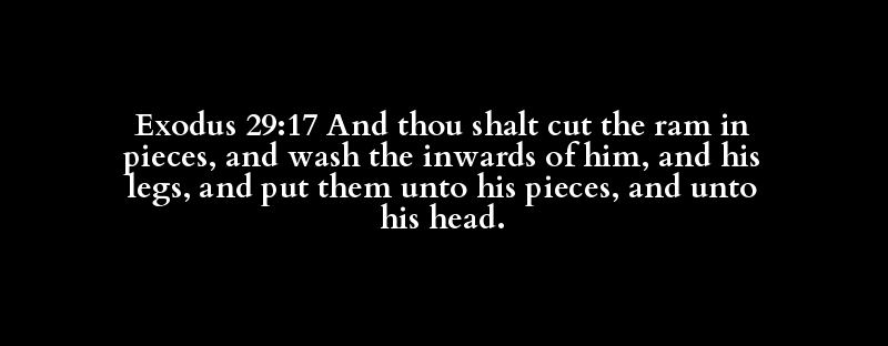 Exodus 29:17 And thou shalt cut the ram in pieces, and wash the inwards of him, and his legs, and put them unto his pieces, and unto his head.