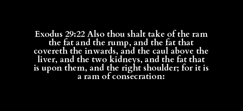 Exodus 29:22 Also thou shalt take of the ram the fat and the rump, and the fat that covereth the inwards, and the caul above the liver, and the two kidneys, and the fat that is upon them, and the right shoulder; for it is a ram of consecration: