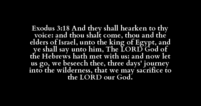Exodus 3:18 And they shall hearken to thy voice: and thou shalt come, thou and the elders of Israel, unto the king of Egypt, and ye shall say unto him, The LORD God of the Hebrews hath met with us: and now let us go, we beseech thee, three days' journey into the wilderness, that we may sacrifice to the LORD our God.