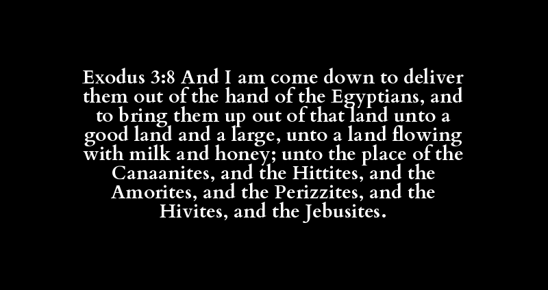 Exodus 3:8 And I am come down to deliver them out of the hand of the Egyptians, and to bring them up out of that land unto a good land and a large, unto a land flowing with milk and honey; unto the place of the Canaanites, and the Hittites, and the Amorites, and the Perizzites, and the Hivites, and the Jebusites.