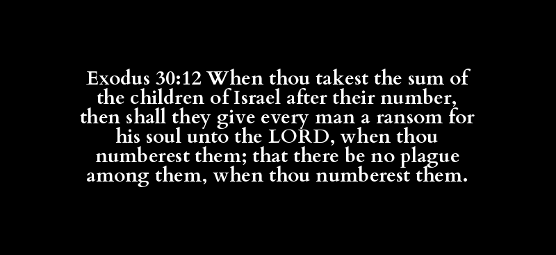 Exodus 30:12 When thou takest the sum of the children of Israel after their number, then shall they give every man a ransom for his soul unto the LORD, when thou numberest them; that there be no plague among them, when thou numberest them.