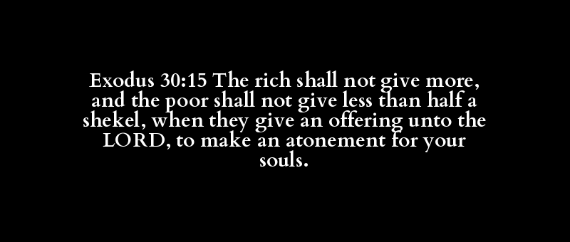 Exodus 30:15 The rich shall not give more, and the poor shall not give less than half a shekel, when they give an offering unto the LORD, to make an atonement for your souls.