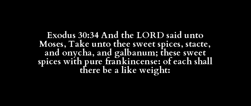 Exodus 30:34 And the LORD said unto Moses, Take unto thee sweet spices, stacte, and onycha, and galbanum; these sweet spices with pure frankincense: of each shall there be a like weight: