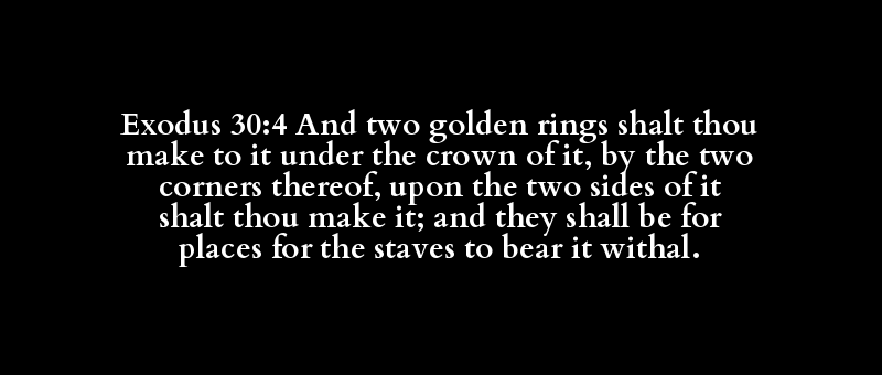Exodus 30:4 And two golden rings shalt thou make to it under the crown of it, by the two corners thereof, upon the two sides of it shalt thou make it; and they shall be for places for the staves to bear it withal.