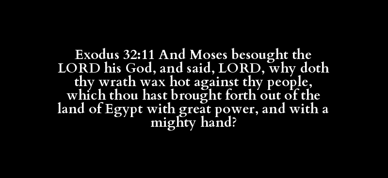 Exodus 32:11 And Moses besought the LORD his God, and said, LORD, why doth thy wrath wax hot against thy people, which thou hast brought forth out of the land of Egypt with great power, and with a mighty hand?