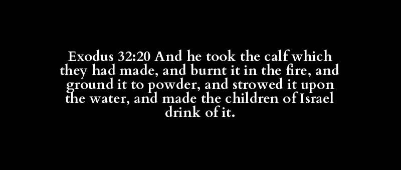 Exodus 32:20 And he took the calf which they had made, and burnt it in the fire, and ground it to powder, and strowed it upon the water, and made the children of Israel drink of it.