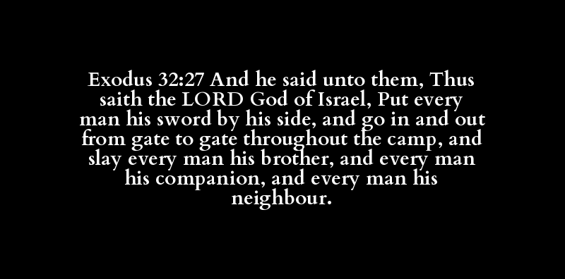 Exodus 32:27 And he said unto them, Thus saith the LORD God of Israel, Put every man his sword by his side, and go in and out from gate to gate throughout the camp, and slay every man his brother, and every man his companion, and every man his neighbour.