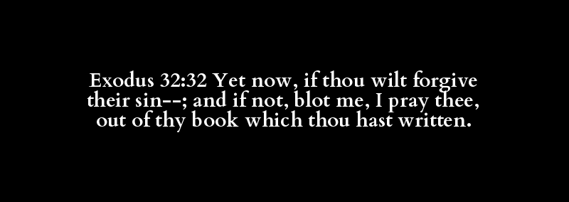 Exodus 32:32 Yet now, if thou wilt forgive their sin--; and if not, blot me, I pray thee, out of thy book which thou hast written.