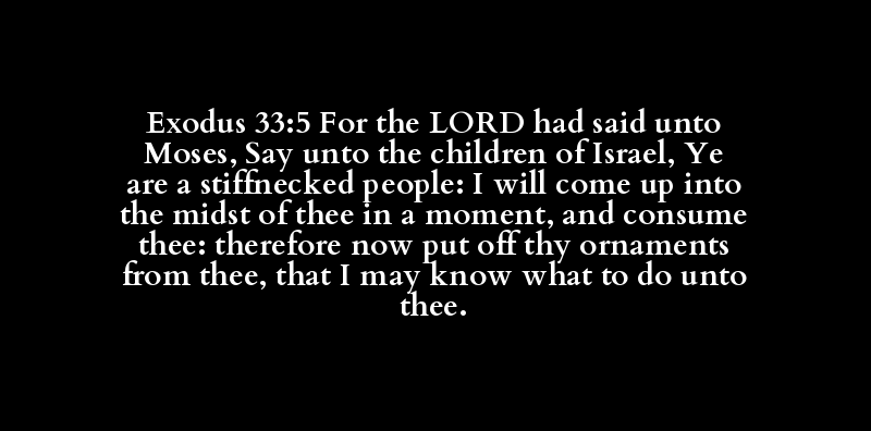 Exodus 33:5 For the LORD had said unto Moses, Say unto the children of Israel, Ye are a stiffnecked people: I will come up into the midst of thee in a moment, and consume thee: therefore now put off thy ornaments from thee, that I may know what to do unto thee.
