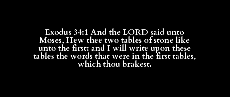 Exodus 34:1 And the LORD said unto Moses, Hew thee two tables of stone like unto the first: and I will write upon these tables the words that were in the first tables, which thou brakest.
